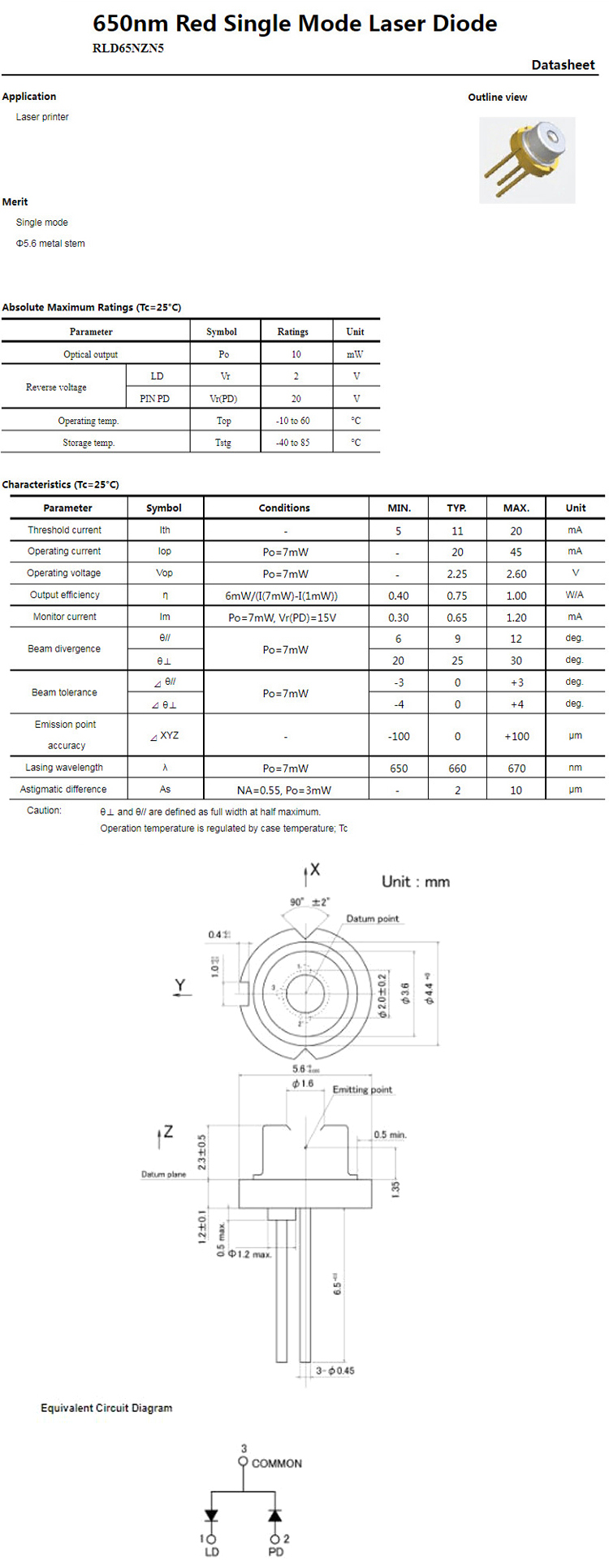 | Title: | 650nm 660nm 7mW To-18 5.6mm N-type Red Single Mode Laser Diodes RLD65NZN5 | ||