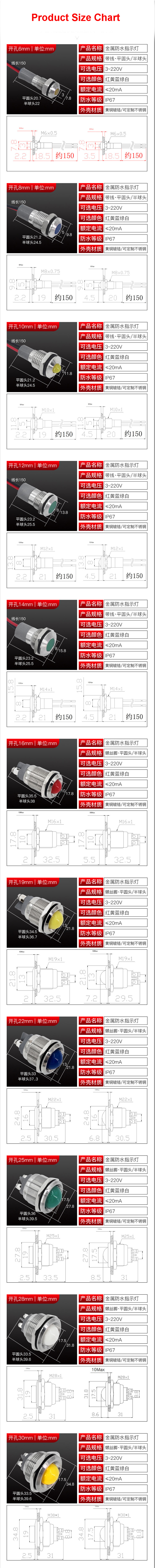 Flat round Hemispherical LED Metal Indicator Light 6mm-30mm Power Supply Waterproof Signal Light 6V-24V